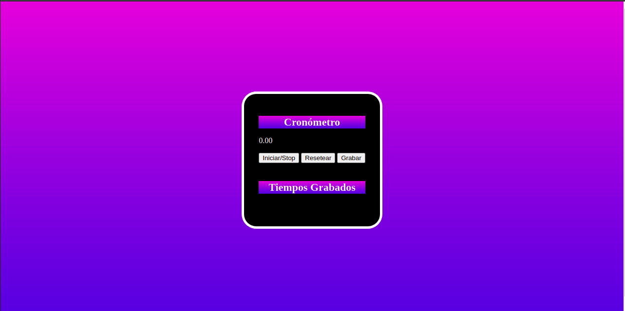 Cronometro construido principalmente con Javascript, cuenta con la función de grabar, detener y pausar tiempos.